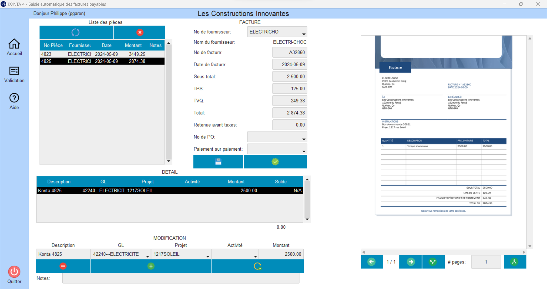 Konta saisira la facture au montant de 1000$ avant taxes, puis calculera automatiquement la TPS et la TVQ sur le montant de 1000$.